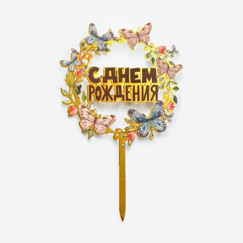 Доставка Топпер декоративный акриловый "С днём рождения. Бабочки" Золото 10х15,5 см из магазина в вашем городе: