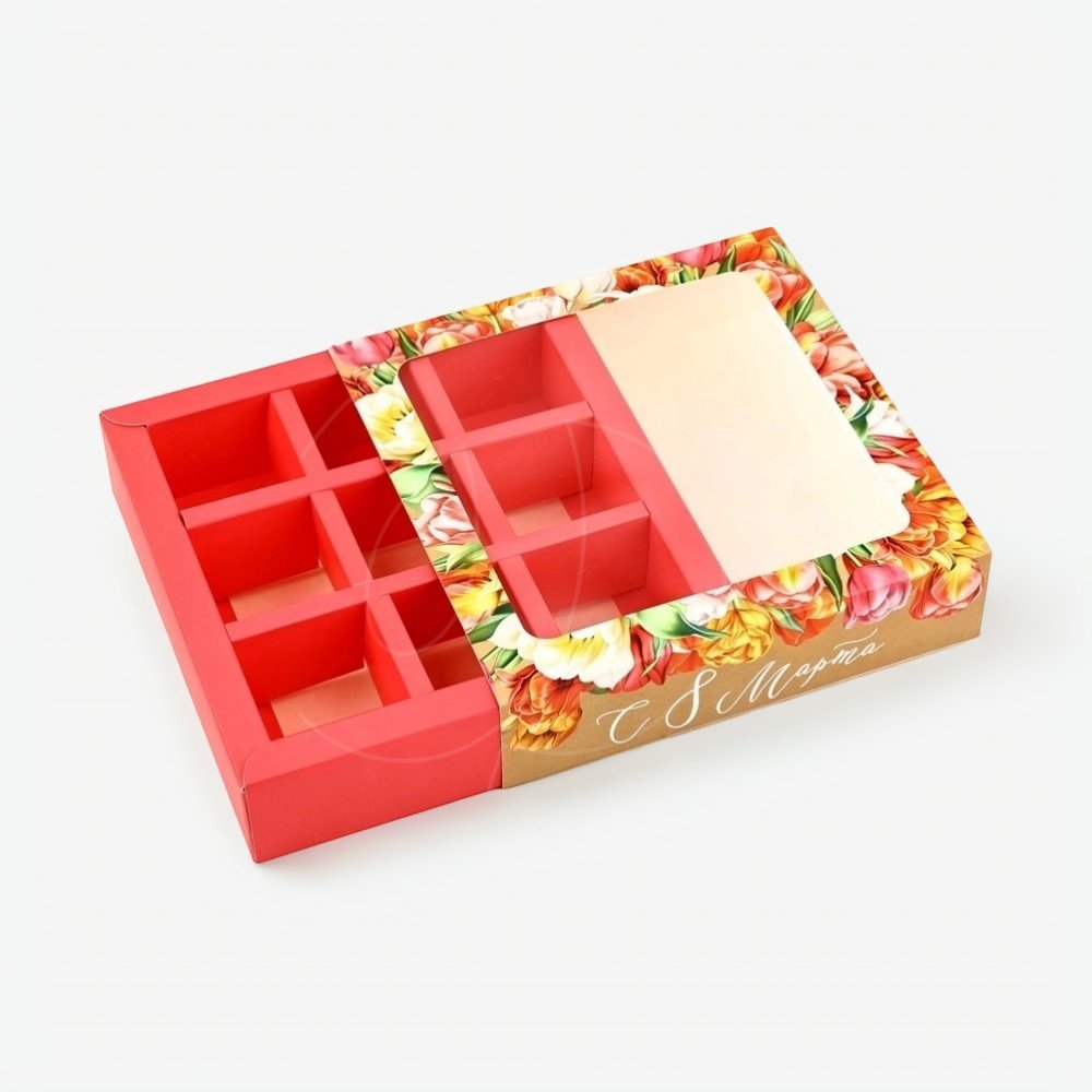 Доставка Коробка на 9 конфет с пластиковой крышкой "С праздником весны" 14,5х14,5х3 см из магазина в вашем городе: